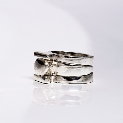 This solid sterling silver interlocking spinning ring uses irregular design lines played out over a contrasting, monochromatic palette using angular and faceted nugget shaped clusters of specular solid sterling silver. Geometric interlocking, nature inspired and referencing opulence with romance. Delicate design touches contrast bold pieces with a presence to behold.