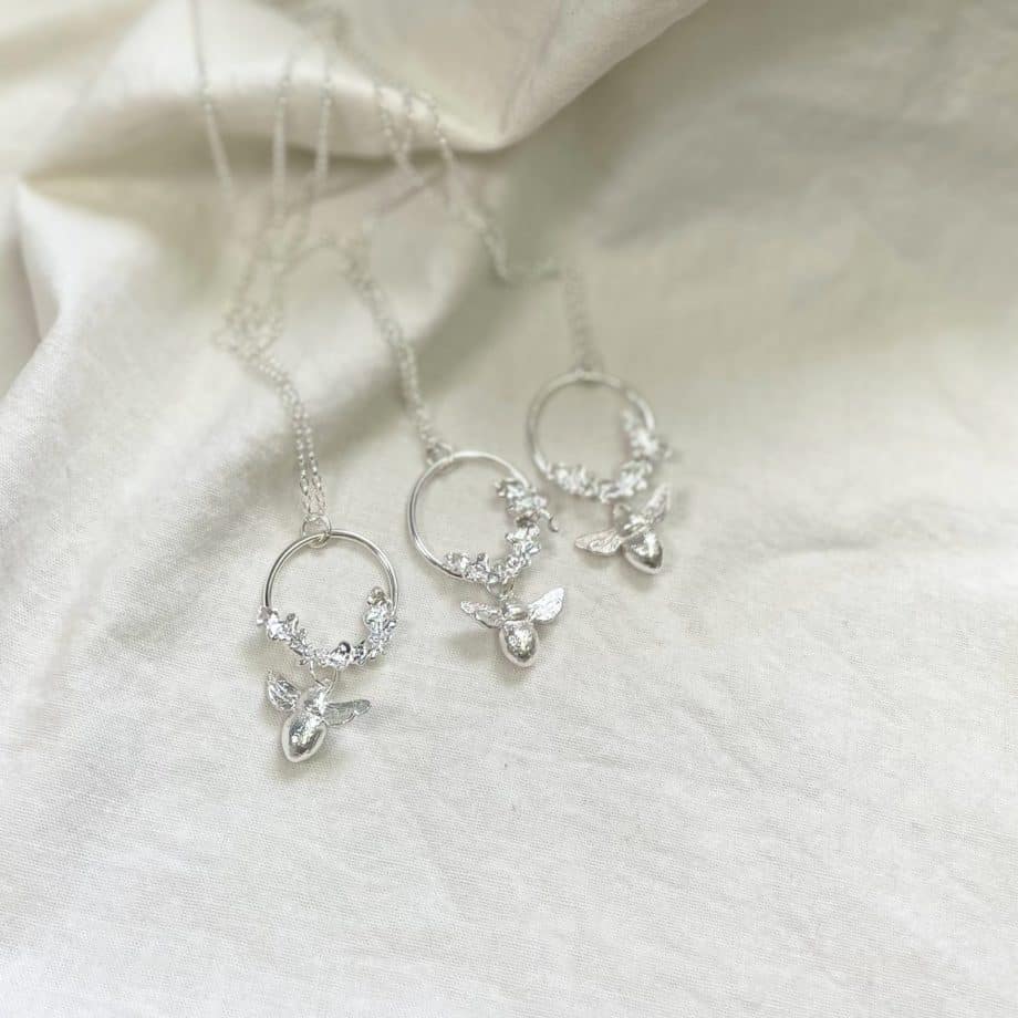 Sweetest Garland Bee Necklace with T-bar fastening. Beautifully textured body and wings sit along side the oak leaves.