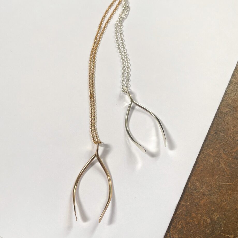 Carry your wishes with you, with this organic filled gold handcrafted wishbone necklace.