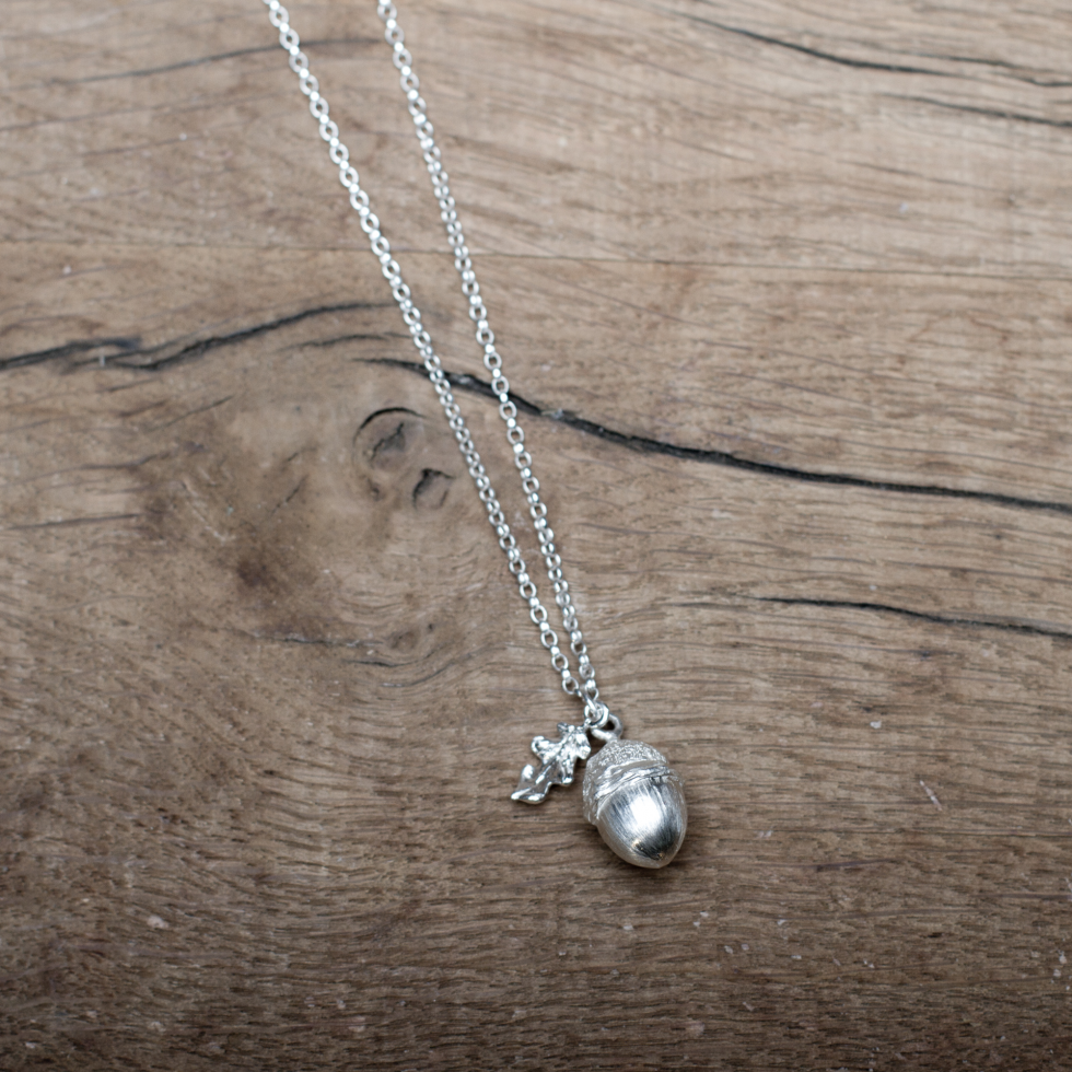 Cloversoul young english acorn with leaf is beautifully textured. Attached to a belcher chain with T-bar fastening.