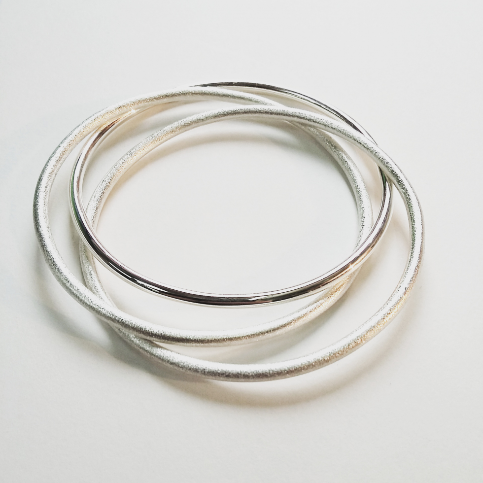 Three heavy-duty interlocking bangles, designed for both strength and style. Two feature a frosted finish, while the third is polished to create a luscious contrast that highlights the unique beauty of each piece.